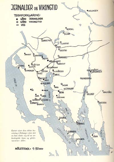kjent av folk, som må ha brukt dem som landemerker. Naturlig nok har derfor tre av øyene navn etter sine natureiendommeligheter. Håøya (egentlig Háøy) betyr den høye øya, og den er ganske riktig høy og har mye fjell. Sandøya (egentlig Sandøy) betyr sandet øy, og dette stemmer bra med jordsmonnet der. Dessuten er det sandgrunner nesten helt rundt den. Bjørkøya (egentlig Bjarkøy) må ha fått navnet sitt etter treslaget bjørk som vokser der. Opprinnelsen til navnet Siktesøya (egentlig Siktisøy) er sannsynligvis en noe annen. Første leddet i dette navnet kommer muligens av Sigþer eller Sigtyr som begge er gamle tilnavn på guden Odin. Øya må i så fall ha hatt sammenheng med et kultsted for denne guddommen. Opprinnelsen og tolkingen av navnet er likevel meget usikker. Skulle det virkelig ha noen sammenheng med Odindyrkelsen, kan det være yngre enn navnene på de førstnevnte tre øyene. Så vidt en vet, var Odin-dyrkelsen forholdsvis lite utbredt, og han regnes for en temmelig ung gud. På den annen side er Siktesøya den eneste gården på noen av øyene som finnes omtalt i noen skriftlig kilde før 1500. I nyere tid ble hverken den ene eller de andre øygårdene regnet for så svært store. Sannsynligvis var nok øynavnene kommet i hevd en god stund før det bosatte seg folk på dem. Så sentralt som de lå til for eldre tiders kommunikasjonsmidler, er det likevel vanskelig å tro at ikke folk nokså tidlig, sannsynligvis alt i eldre jernalder, slo seg fast ned på dem. Grunnen til at gårdsdannelsene der ikke ble så store, kan være at folk som bodde der, mer ga seg i kast med fiske enn med jordbruk.Alt i tidsrommet 300 til 600 etter Kristus må sannsynligvis alle de nevnte gårdene ha blitt ryddet, muligens med unntak av øyene og Oklungen. Øst, vest og syd for Eidangerfjorden fantes, i hvert fall i slutten av denne perioden, minst ti gårder som på grunn av den lette adkomsten over fjorden må ha hatt god kontakt med hverandre. Forbindelsen østover til Langangen behøver heller ikke ha vært helt dårlig. Den gikk sjøveien, innenskjærs og stort sett i lunt farvann. På alle disse gårdene bodde det sannsynligvis flere mennesker enn noen gang senere i historien. Så vidt en vet, holdt folk sammen i storfamilier. Generasjonene bodde sammen. Sønnene flyttet ikke ut. Hele ætten drev i fellesskap gården. På de ti gårdene rundt Eidangerfjorden og den ved Langangsfjorden kunne det på denne måten bli svært mange folk. De måtte antagelig gå sammen om visse felles oppgaver. Et visst organisert samvirke oppstod. Særlig må felles vern mot ytre fiender ha gjort dette nødvendig. Yngre del av romersk jernalder, cirka 300 til 400 etter Kristus, og de etterfølgende to hundre årene, den såkalte folkevandringstida, later til å ha vært urolige tider. Etter alt å dømme stod da folk i forskjellige landsdeler steilt mot hverandre. Omvandrende krigerflokker drog rundt og spredte død og ødeleggelse om seg på sin jakt etter nytt land hvor de kunne slå seg ned. Som i så mange andre bygdelag må folket rundt Eidangerfjorden ha sett seg nødt til å opprette et tilflukts- og forsvarssted mot disse røverflokkene. Et slikt sted fant de på den fjellknausen som i våre dager er kalt «Slottet». Det ligger ved Lerstang. Det lå forholdsvis sentralt til for alle gårdene rundt Eidangerfjorden, og var greit å komme til. For fienden å storme bygdeborgen på «Slottet» var derimot ikke lett. Knausen går temmelig bratt ned på alle sider. I forsvaret av den kan nok folket rundt Eidangerfjorden ha blitt sveiset godt sammen.